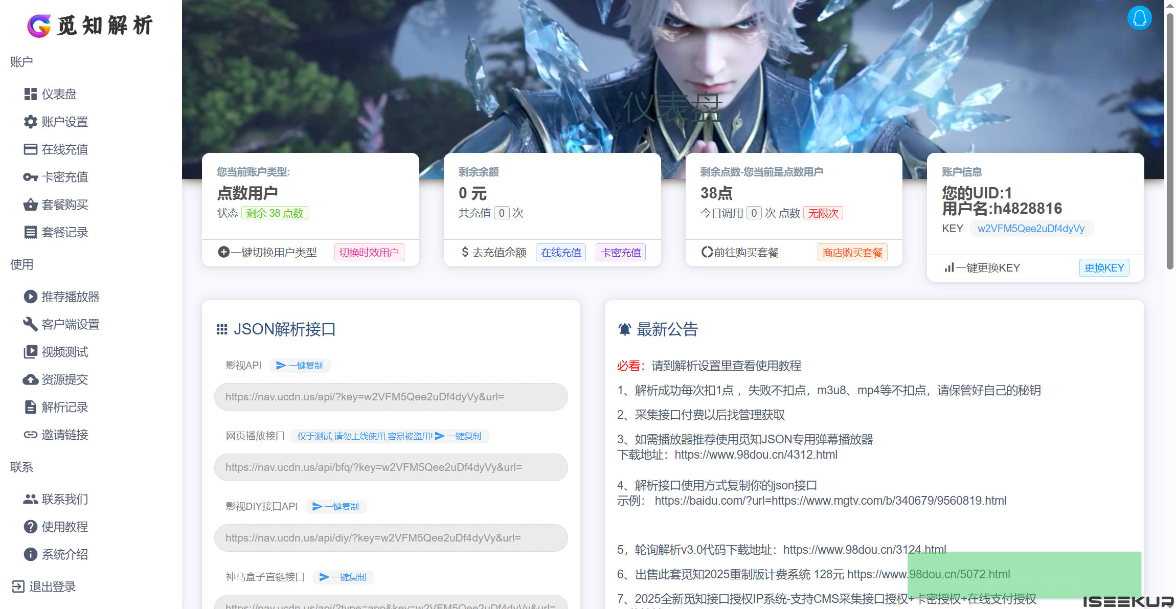 解析接口计费系统也就是多接口管理销售统计系统,可配置多接口和专用特征解析接口,有替换资源系统,对接在线支付,卡密支付,支持点数收费模式和包月套餐收费模式,管理可配置多个视频解析接口、短视频接口、备用解析等等常规功能等等!