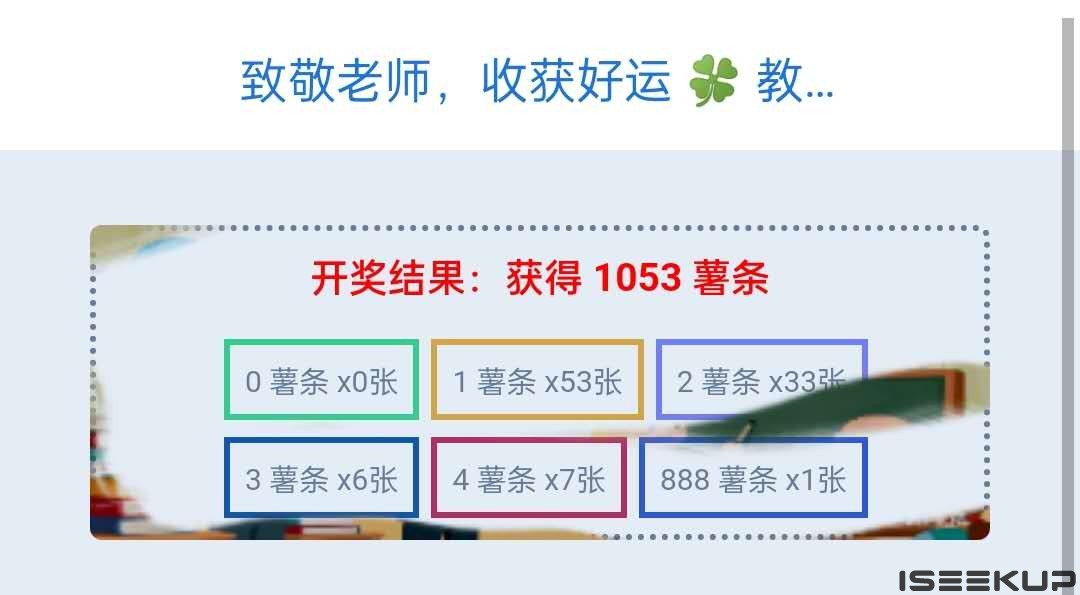 在这个特别的日子里,我们为大家准备了 教师节专属刮刮乐 🎁 有一个888薯条大奖 刮刮乐地址:https://iseekup.com/guaguale